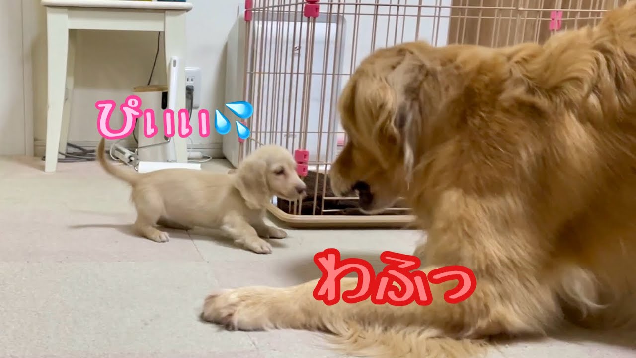 子犬と遊びたい気持ちが出過ぎて逆にビビらせちゃった大型犬クッキー【ゴールデンレトリバーとミニチュアダックスフンド】