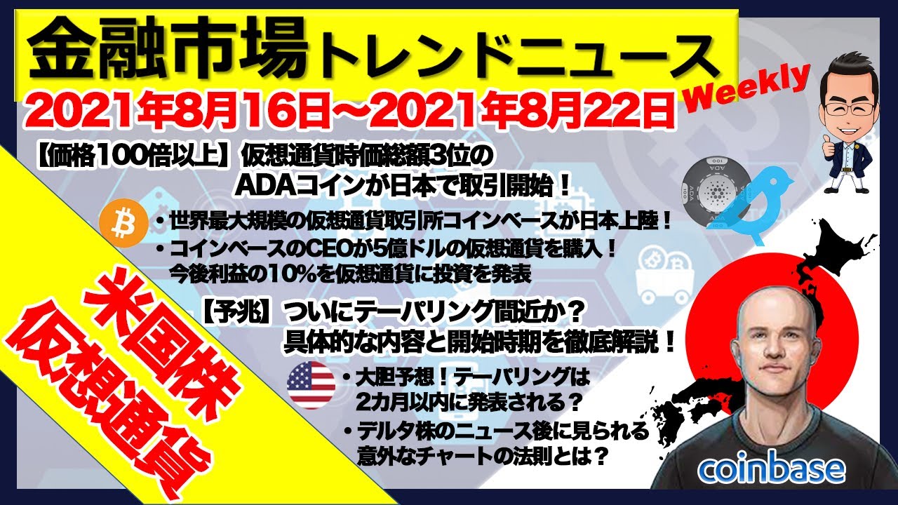 コインベースのクリプト大量買いやADA日本上場など市場大興奮!テーパリングの時期もほぼ確定に近づいてきたか?!【米国株・仮想通貨ニュース 2021年8月第4週】