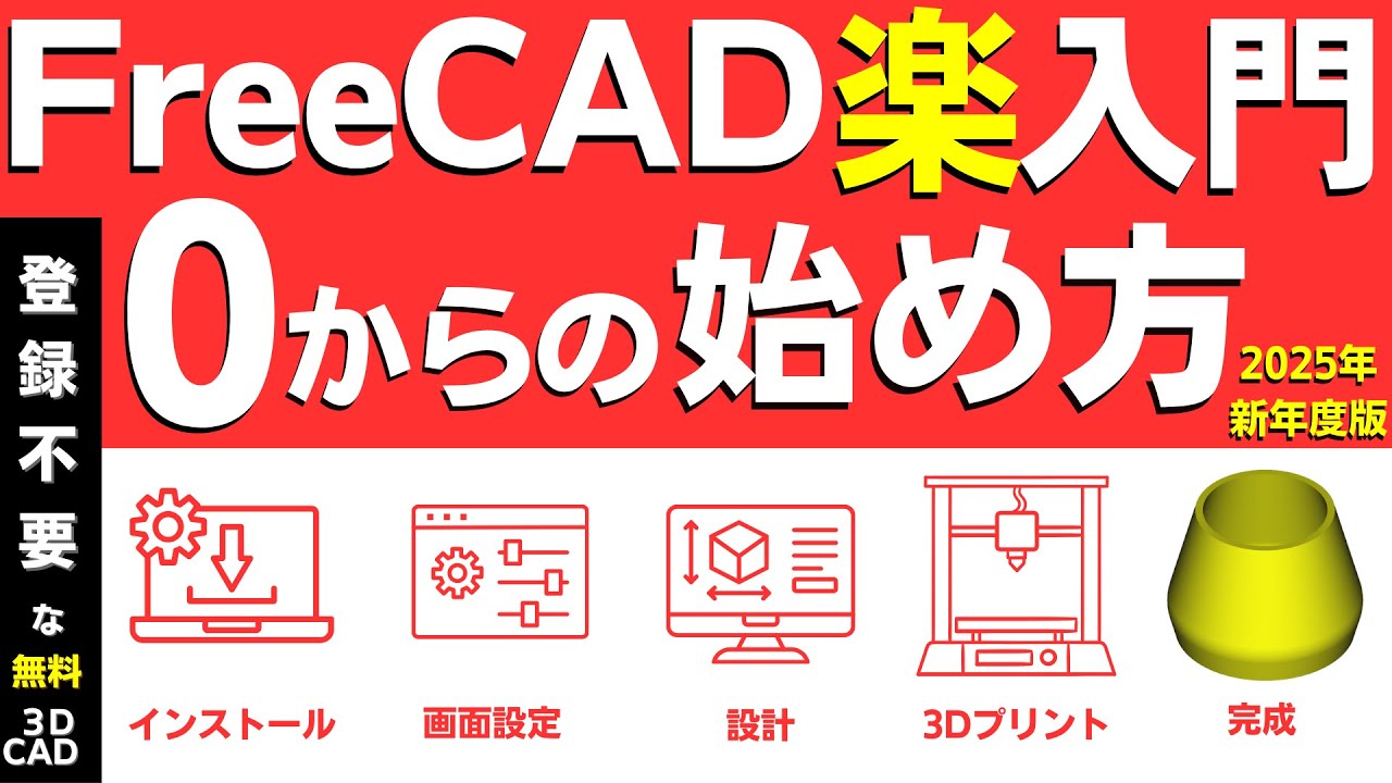 FreeCADの使い方 0(ゼロ)からの始め方、使いにくい、難しいと言われますが、インストール、設定、基本操作、モデルを設計、3Dプリンターで印刷するところまで全体を紹介している入門動画です。