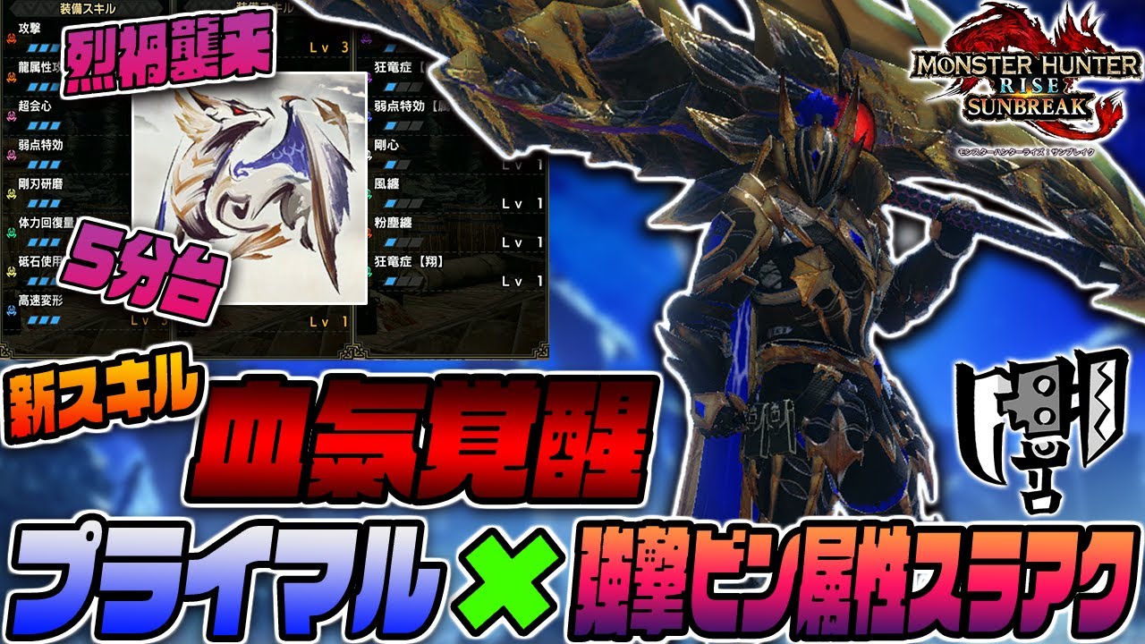 【攻撃と属性爆上がり】新スキル「血氣覚醒」のプライマル一式を強撃ビン属性スラアクで使ってみた!烈禍襲来原初メルゼナ5分台討伐!【モンスターハンターライズサンブレイクver.16】