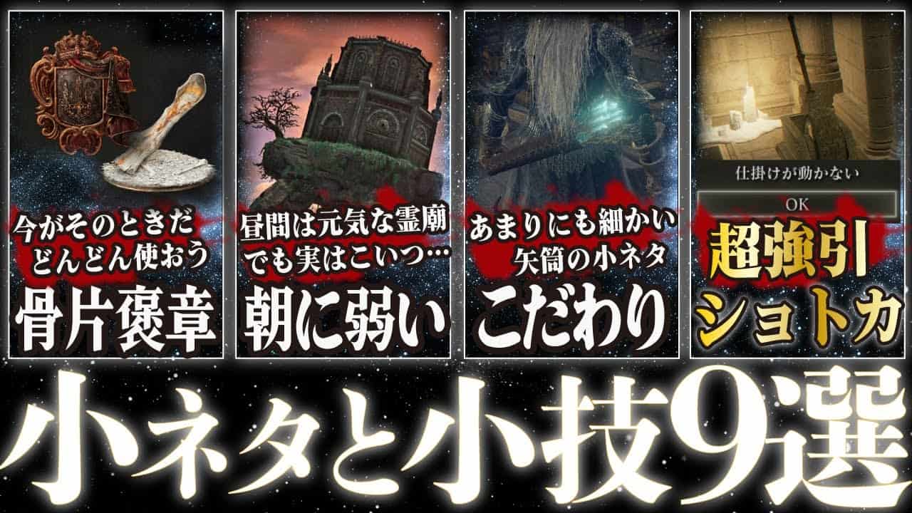 【エルデンリング】ちょっとズルい小ネタと小技を9個くらい紹介!エブレフェールは超強引にショトカできる!そのほか矢筒のこだわり、帰還の骨片のように使える純血騎士褒章や歩く霊廟の弱点について