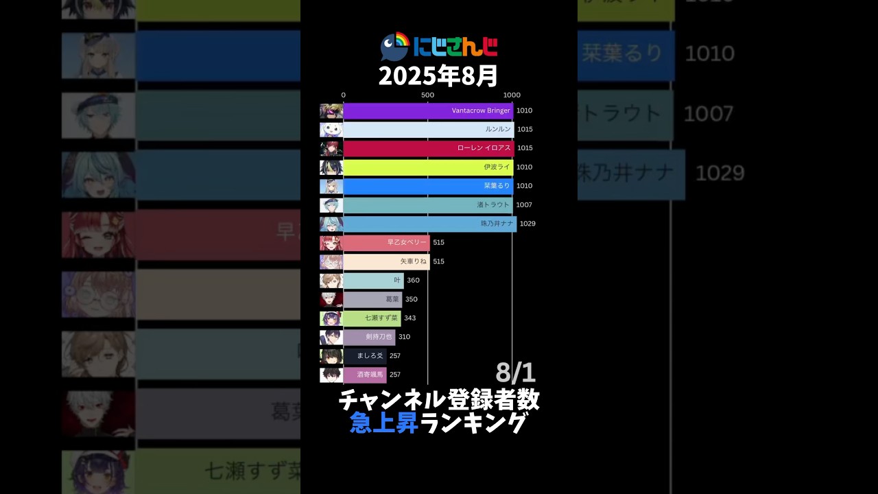 【にじさんじ】2025年8月チャンネル登録者数急上昇ランキング【VTuber】